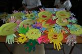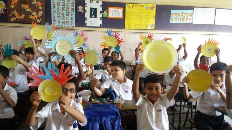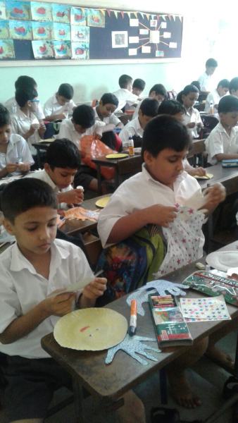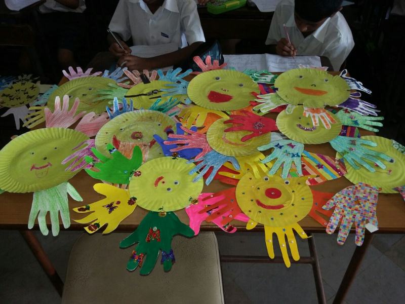 The big boys of the primary section (Std 4) had to make a mask using paper plates, cut outs of their hands with different coloured paper and googley eyes. They had to then stick the cut outs all around the paper plates.