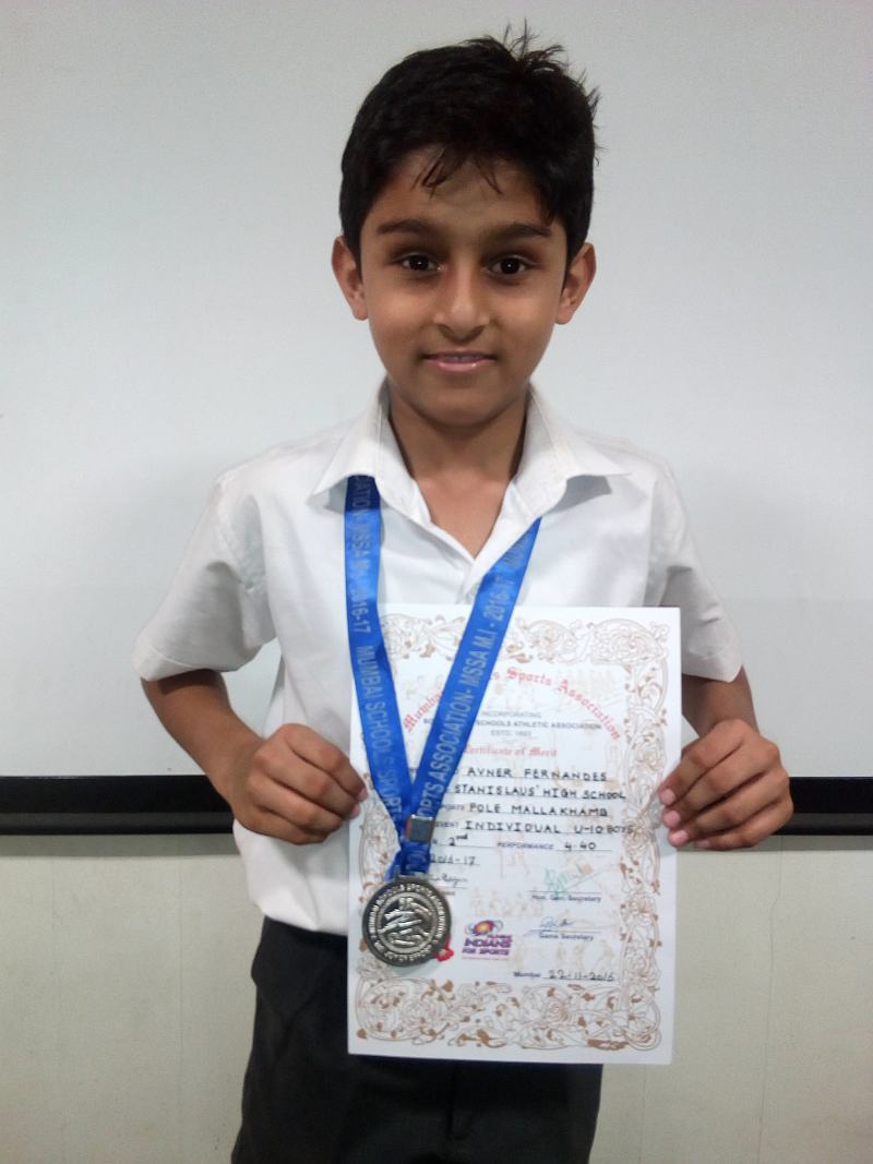 Avner Fernandes of Std 4-B had participated in MSSA event for Mallakhamb in Individual – Pole Mallakhamb on Tuesday 22, November 2016 had stood in 2nd place and was awarded a silver medal and a certificate.