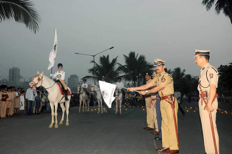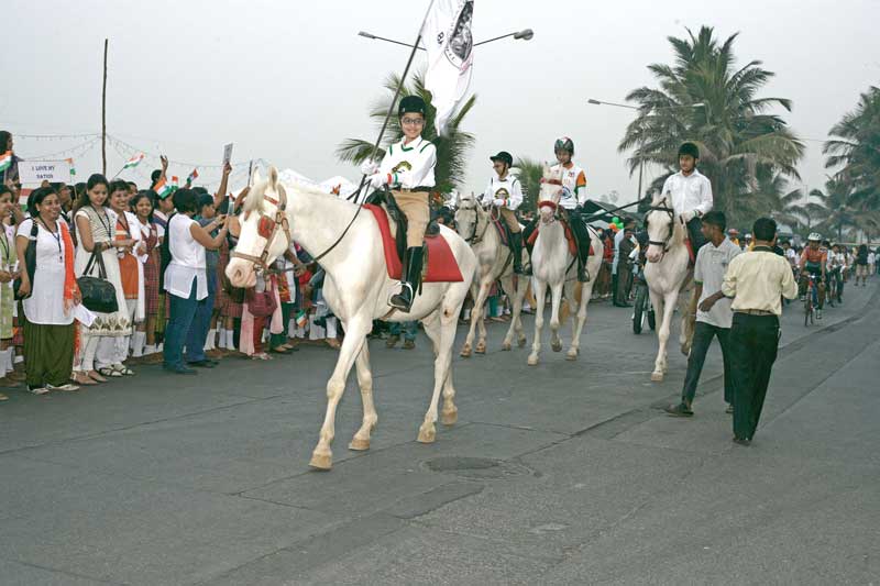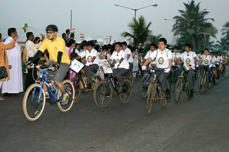 After a successful 2013 Republic Day Parade the Bandra Inter-School Republic Day (BIRD) committee decided to have a bigger and better parade in 2014, and so it came to be when ideas, principals, civic authorities, the military and meticulous planning gelled to celebrate the 65th Republic Day in Bandra. Once again 18 schools participated which included 770 student marchers and their bands, 3 army drill instructors, 54 training teachers for marching co-ordinated by Mr. Elias Corriea (St Stanislaus High School) along with 70 school cyclists trained by Mr. Faisal Thakur (Pro9 Bicycle Studio) to spread an Eco friendly message. Adding punch and grandeur to this unique parade was the elite Rapid Action Force (RAF) which marched with the children thereby raising the bar. A festive military touch to this children’s parade was an Army Bagpipe Band from the Nashik Artillery Centre. Their ethereal music and spectacular marching enthralled many.